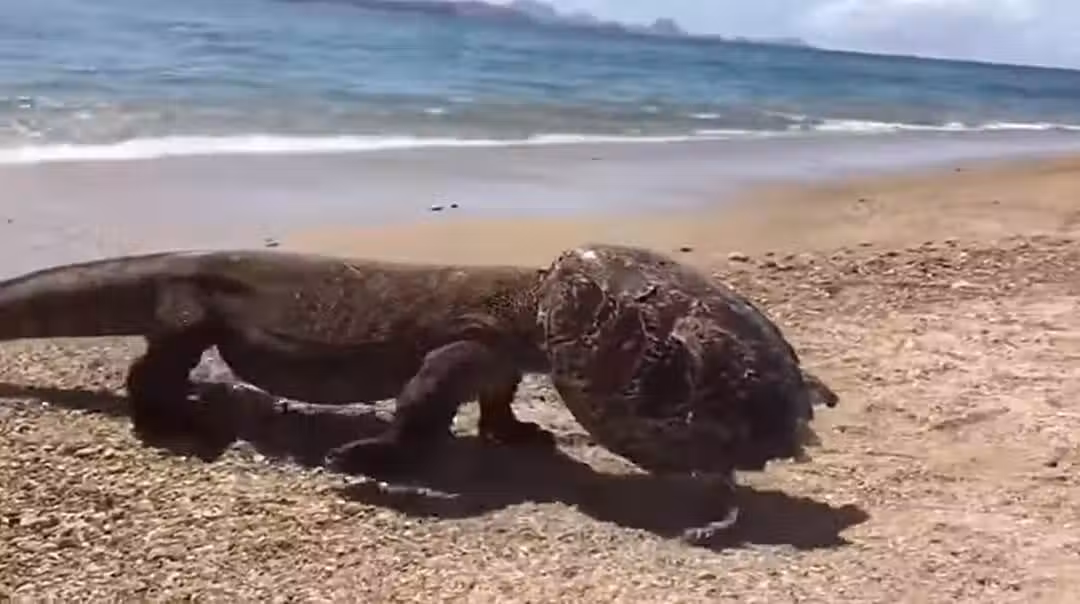 遊客懷著忐忑的心情,接近怪龍後,用相機記錄下這神奇的一幕。他驚訝地發現原來那根本不是什麼「頭盔」,而是一隻大海龜卡在科莫多龍頭上,兩種動物剛剛應該是經歷了一場纏鬥,科莫多龍的頭卡在龜殼裡,看起來兩隻動物都不好受。