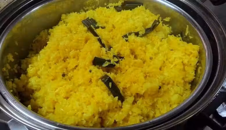 4) 食用前取走香茅, 沙楠葉及班蘭葉, 將黃薑飯拌勻就可食用.