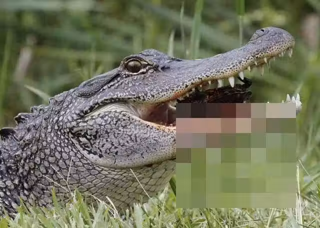 鱷魚深淵巨口含住烏龜,幼小烏龜無力反抗,下秒鱷口緊閉龜殼盡碎龜腸流出