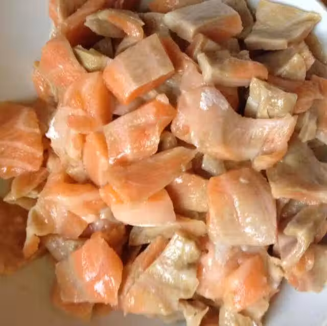 三文魚200g;蟹味菇100g;檸檬1隻;鹽少許;料酒少許