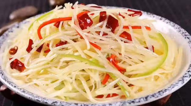 8.將土豆絲瀝凈水份,香菜紅椒蔥絲放在一起。
