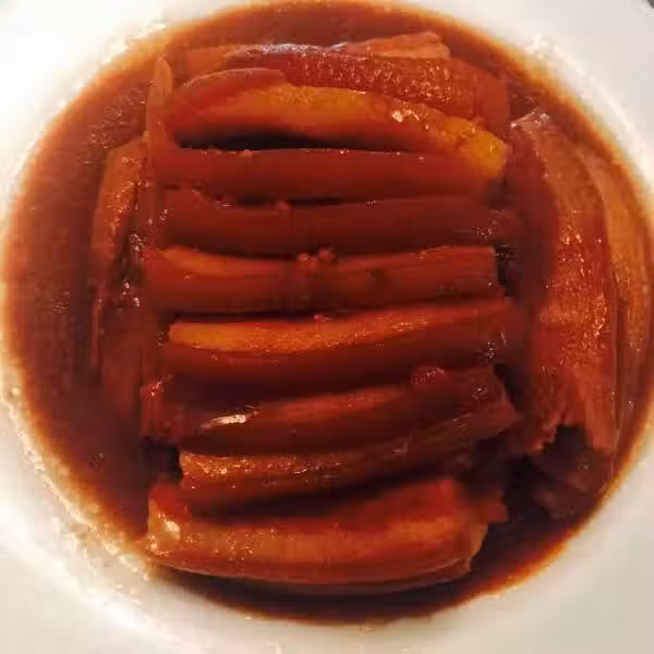 9關火後會看到出了些湯,取出後把湯汁篦到一個碗中。用另一個盤子扣緊肉,快速翻轉,漂亮的肉片就扣到上面了。把那碗湯汁入炒鍋收濃(如果嫌油多就撇出上面的一層油),也可以調點澱粉水勾下欠,淋在扣肉上即可。