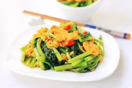 茼蒿洗乾淨切成段,用熱水焯一下,雞蛋液中加入吃蔥花,攪拌均勻後炒熟,在熱油鍋中爆香大蒜,放入茼蒿,顏色變深綠後加入雞蛋、鹽、蚝油,翻炒均勻就可以了。