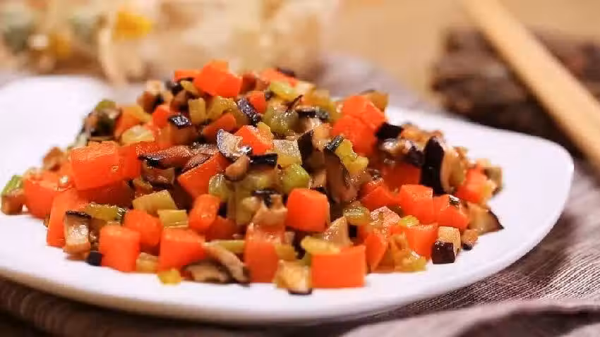 5、接著鍋中倒入胡蘿蔔丁,大火翻炒片刻