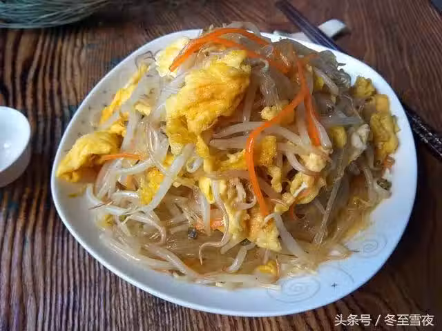 【雞蛋粉絲炒綠豆芽】 主料:綠豆芽250克、雞蛋2個、粉絲1把、胡蘿蔔1段、 輔料:植物油3湯匙、鹽3克、蔥1段、大蒜2瓣、醋幾滴