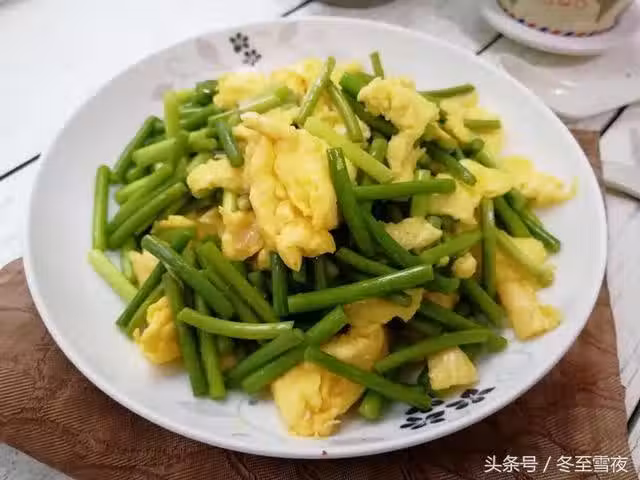 【雞蛋炒蒜薹】材料:雞蛋3個、蒜薹250克、油鹽適量,蔥1段 做法: