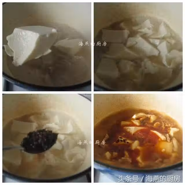 絹豆腐用勺子舀成碎塊狀放入鍋中