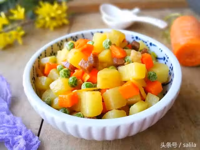 家裡的小朋友有些挑食,胡蘿蔔打小就不太喜歡吃,今天換了一種花樣,將土豆,胡蘿蔔切成丁和青豆,豬肉一起做了一道家常菜。光看到這漂亮的顏色孩子就按奈不住地拿起勺子嘗了嘗,嘗過後一發不可收,一口接一口直往嘴裡送。連平時不愛吃的菜也一起不知不覺吃進去了。看來對付挑食的孩子還是需要媽媽們多花一點心思,平常做菜的時候一定要注意搭配,盡量做到樣式多一些,顏色豐富一些,至少從視覺上就能讓孩子提起吃飯的興趣來。胡蘿蔔含有豐富的胡蘿蔔素,炒熟後吃,在人體內轉化為維生素A,可以提高身體的免疫力,具有補肝明目的功效;青豆可以幫助我們保持血管的彈性,有健腦和預防脂肪肝的功效。