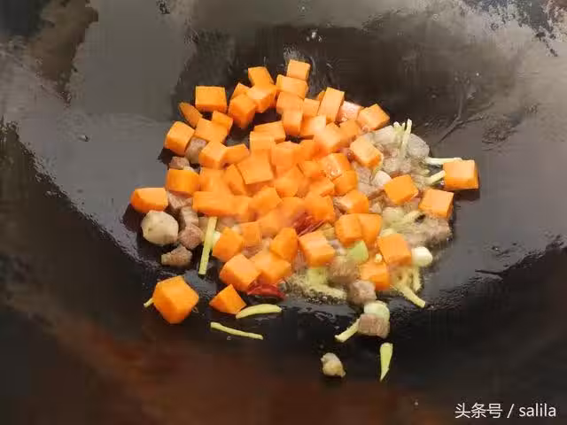 4、胡蘿蔔微微變軟後放入土豆丁和青豆,一直保持中火的狀態翻炒。土豆切成丁後再用清水洗乾淨表面的澱粉,這樣就容易糊鍋了。