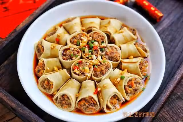 4,在豆腐皮一端放上牛肉餡,細細捲起來,介面壓在底部,用利刀切出食指長度的條,再斜口從中間切開。