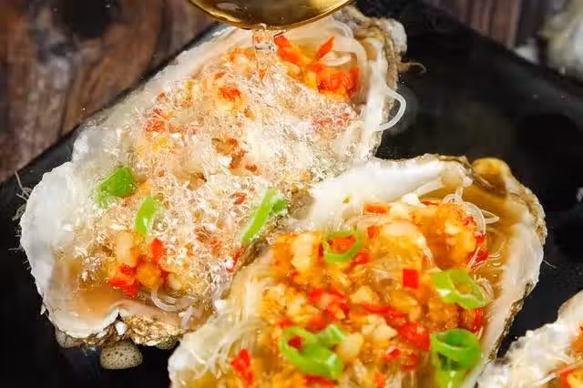 2、鍋子裡加油,燒熱後倒入大蒜、小米辣,炒出香味之後,倒入生抽、蚝油、香油,炒勻後出鍋,澆在生蚝肉上。鍋中大火燒水,燒開放上生蚝,大火蒸5分鐘,就可以拿出來了,撒上蔥花開吃。