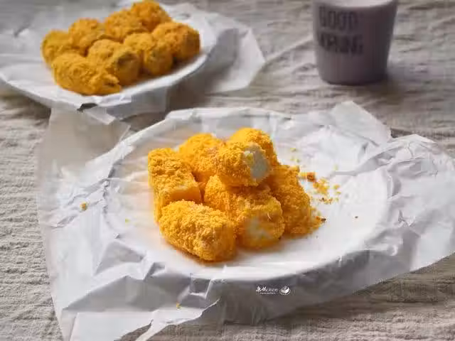 我做這個炸牛奶很簡單,先把一盒牛奶和一大勺澱粉拌勻,加入砂糖後煮至濃稠麵糊狀態,放涼後再冷藏,等牛奶麵糊成形再切塊,沾上麵包糠,用空氣炸鍋烘烤。這樣做炸牛奶不用擔心孩子吃了上火,孩子也可以放心吃。我用這個方法還烤了兩根香蕉,孩子很喜歡這美味呢。