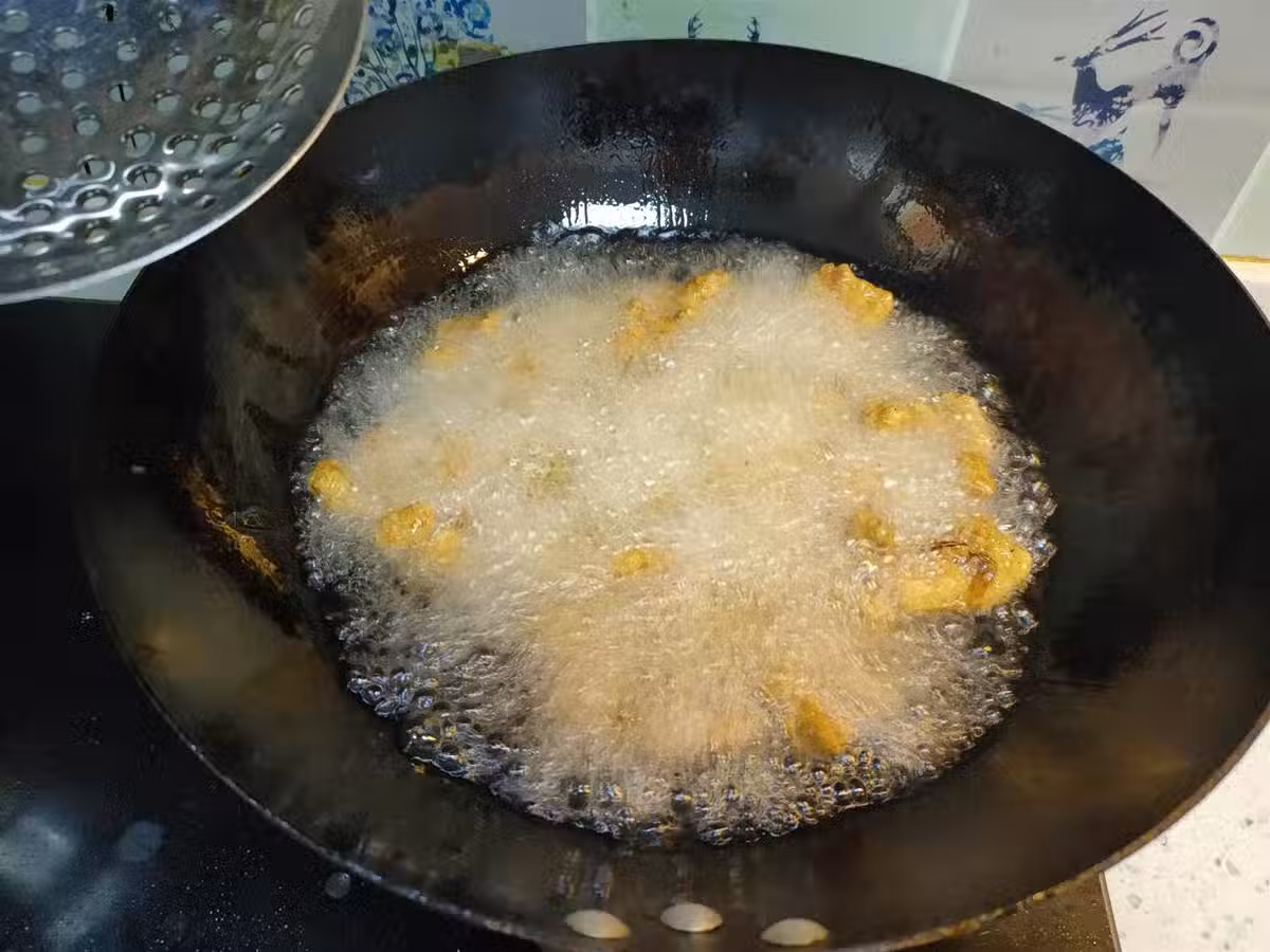 5、鍋裡油溫燒至六成,再把肉條下鍋複炸一遍,第二遍把肉條炸酥、炸脆,然後撈出來控油。