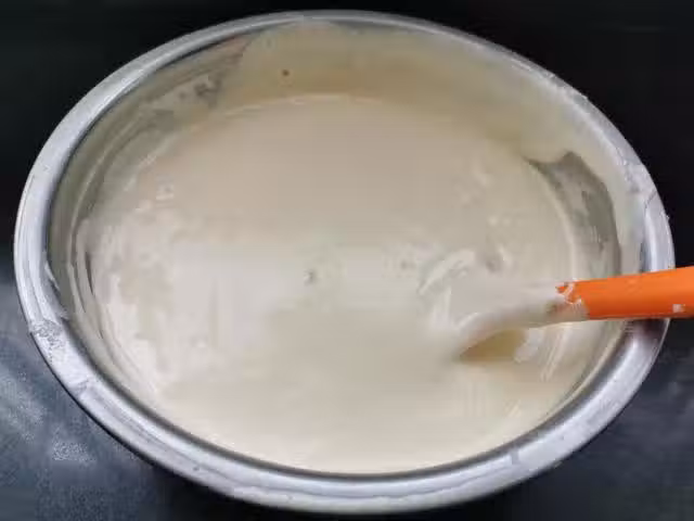 將三分之一的蛋清加入到蛋黃糊中,用炒菜的手法拌勻,再倒入三分之一蛋清拌勻,最後反過來將拌好的麵糊倒入到剩下的蛋清中,拌勻。