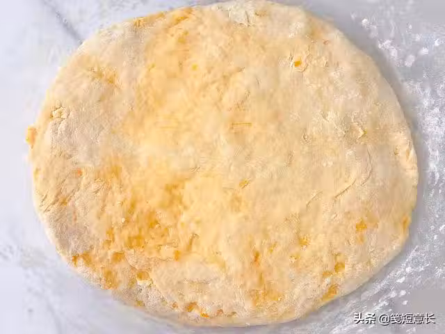 5、揉好的麵糰不需要醒面,案板上撒一層乾麵粉防粘連,將南瓜麵糰取出揉勻排氣。用擀麵杖擀成一大塊厚麵餅,隨便找一個口徑中等的玻璃杯,在麵餅上按壓出圓形的小餅。