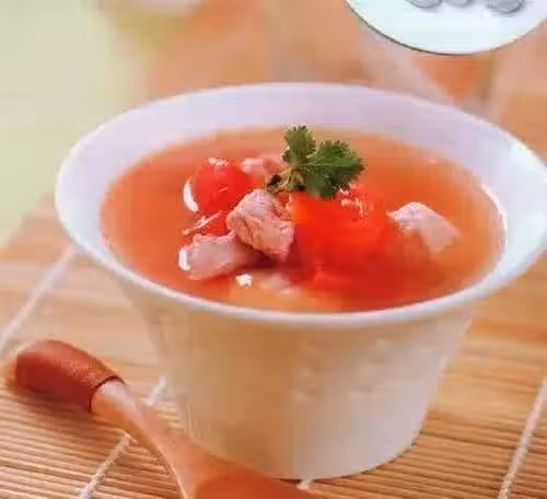 番茄含有茄紅素,它是一種類胡蘿蔔素,可以抗氧化,消除自由基,還能預防膽固醇堆積,具有降血壓、降低膽固醇、減肥的功效,多喝此湯可以保持年輕,使臉色紅潤。