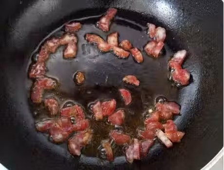 第三步,炒鍋中添上適量的食用油,先放入臘腸丁,煸炒至透明的時候,將蝦米、香菇和花生碎一同放入鍋中,小火慢慢煸炒,直到將其所有的食材都炒熟,即可關火盛出晾涼;