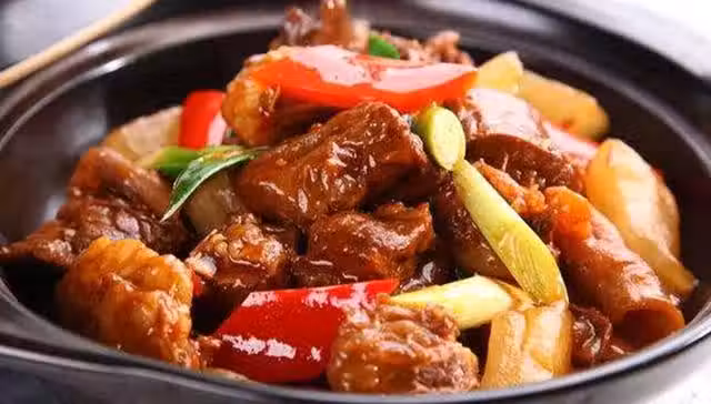 具體做法如下:紅椒切塊,小蔥切段,牛腩切大塊焯水,香料洗凈入袋,放入1000毫升開水煲出味,薑片下油鍋爆香,牛腩改刀切小塊,時煎時炒,直至牛腩表面焦褐色,把油全盛起,下料酒,加入醬油翻炒,再加水至末過牛腩,加鹽、雞粉,加冰糖,蓋上鍋蓋小火燉1小時,起鍋前加入紅椒塊,翻炒至斷生,最後加入蔥段即可!