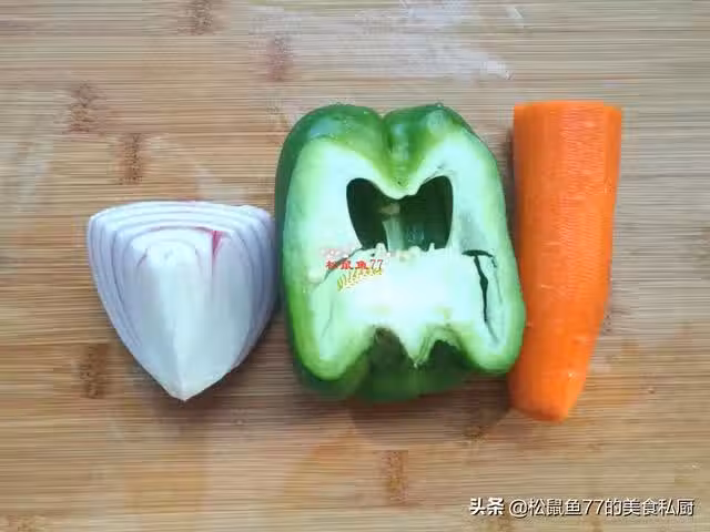 1、準備好所有的食材。洋蔥去皮洗凈,切一小塊就夠了,青椒清洗乾淨留半個,胡蘿蔔去皮洗凈取1小段。