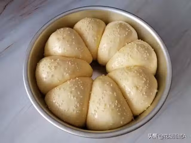 9、大概發酵了45分鐘,比之前大了許多,然後刷上蛋液,再撒上芝麻,放烤箱烘烤就行了。