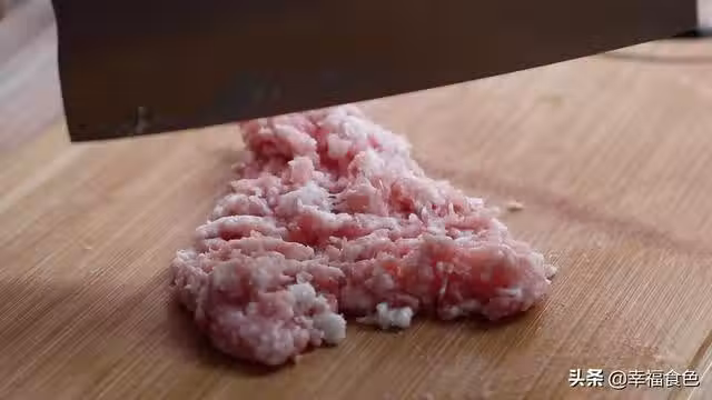 5、放入剁好的五花肉末。一邊翻炒一邊按壓,直到五花肉鬆散,我們剁肉的時候可以盡量剁碎一些,口感會更好。