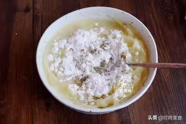 4.手心上沾點水,用勺子挖起一勺土豆泥放在手心中壓緊,再用雙手揉圓。