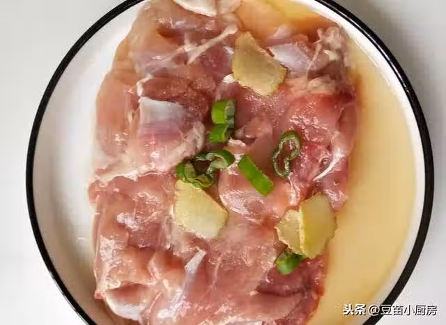 雞腿需要稍微大一點的,一個就可以,用刀從雞腿上劃開,把骨頭剔出來,然後放入一勺料酒,少許蔥薑絲,腌制20分鐘。
