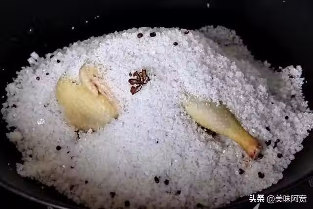 雖然說雞肉的做法是多種多樣的,但是在我家最受歡迎的還是這種做法,首先來準備一隻雞,將它處理乾淨,鍋中倒入8斤左右的鹽,將鹽炒干,鹽炒干之後下入八角,花椒,繼續翻炒,超出香味,炒香之後盛出一部分鹽放在碗中,然後再將剩下的鋪平,把雞放進去,然後再將盛出來的鹽倒進去,將雞肉全部覆蓋,開中小火燜1個小時左右,1個小時之後關火,然後再燜1個小時左右打開蓋子取出來,好吃又簡單的鹽焗雞就做好了。就是這麼簡單,不需要太多的調料,不用油,不用水,只用鹽簡單一燜,鮮香嫩滑就還解饞。