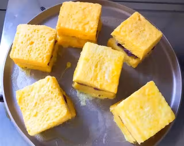小貼士:我這裡做的是紫薯餡的西多士,大家可以換成任何自己喜歡的餡料,夾什麼都可以哦;裹蛋液的過程要快,裹好後要立刻撈起,否則吐司會泡軟。