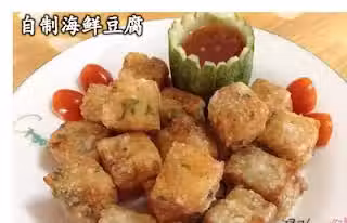 材料:魚肉100克,蝦肉100克,紅蘿蔔1小段,蒜頭4粒,蔥仔4粒,青蔥1棵【全部材料切細】,蛋豆腐(壓碎)2條 調味料:雞精粉2茶匙,鹽半茶匙,胡椒粉半茶匙,糖1茶匙,薯粉2湯匙 做法:1.把全部材料和調味料放入盤裏攪拌均勻至起膠。2.用7寸盤抹油,放入攪拌好的豆腐鋪平壓緊。3.盤口包上保鮮紙,大火蒸30分鐘至熟。4.起出待涼切塊,沾上薯粉炸至金黃色即可。