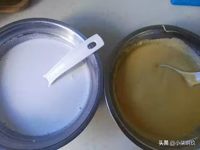 6.上蒸鍋,鍋中放入水,水開後把不鏽鋼盤子放入蒸屜上(我用的是有點深度的盤子 ,刷層薄薄的油,便於脫模)先放一勺南瓜馬蹄汁,蓋鍋蓋大火蒸3分鐘表面凝固,然後關小火,倒入一勺小白漿,再開大火蒸3分鐘,同樣的方法,蒸至9層,最後一層要蒸8分鐘。