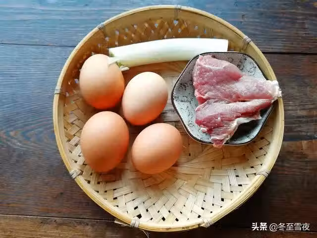 1.準備好所需材料,雞蛋最好用土雞蛋,東北的叫法是「笨雞蛋」,就是農家散養的雞,下的蛋,有營養,豬肉用廋肉做就可以,有肥肉吃著比較膩。