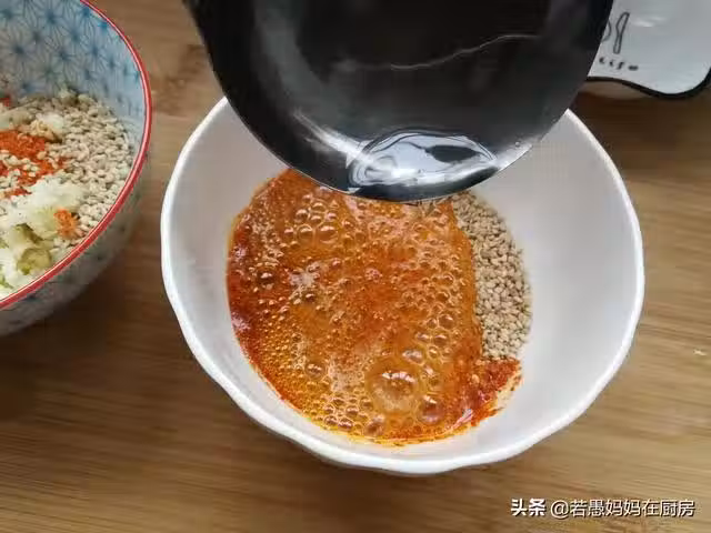 6、剩下的熱油倒在辣椒麵芝麻蒜末碗中。一邊倒一邊攪拌,讓辣椒麵和蒜末的香味散發出來。