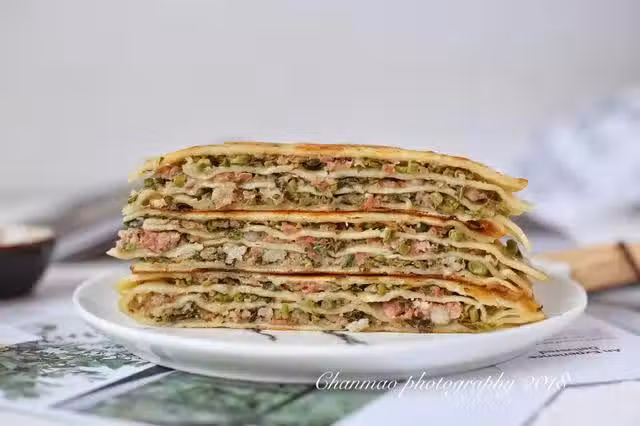 4,擀開麵糰成薄片,將豬肉香椿鋪在上面