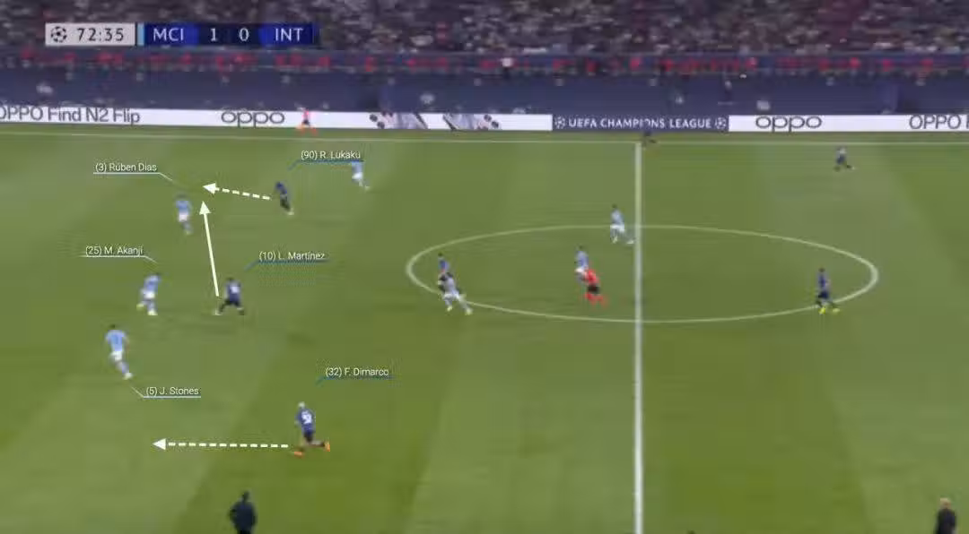 但人們也不能忘記接球的一方,歐冠決賽第85分鐘,奧納納在埃爾林·哈蘭德的緊逼之下,送出精準長傳。前場的兩名前曼聯球員形成了配合,盧卡庫接球後一腳回敲給姆希塔良。