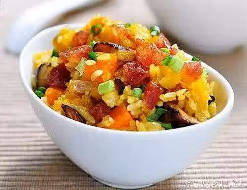 食材:老南瓜200g,大米1杯,臘腸1根,香菇2朵,洋蔥80g,胡蘿蔔50g,鹽適量,蚝油1勺,雞精少許,蔥花少許