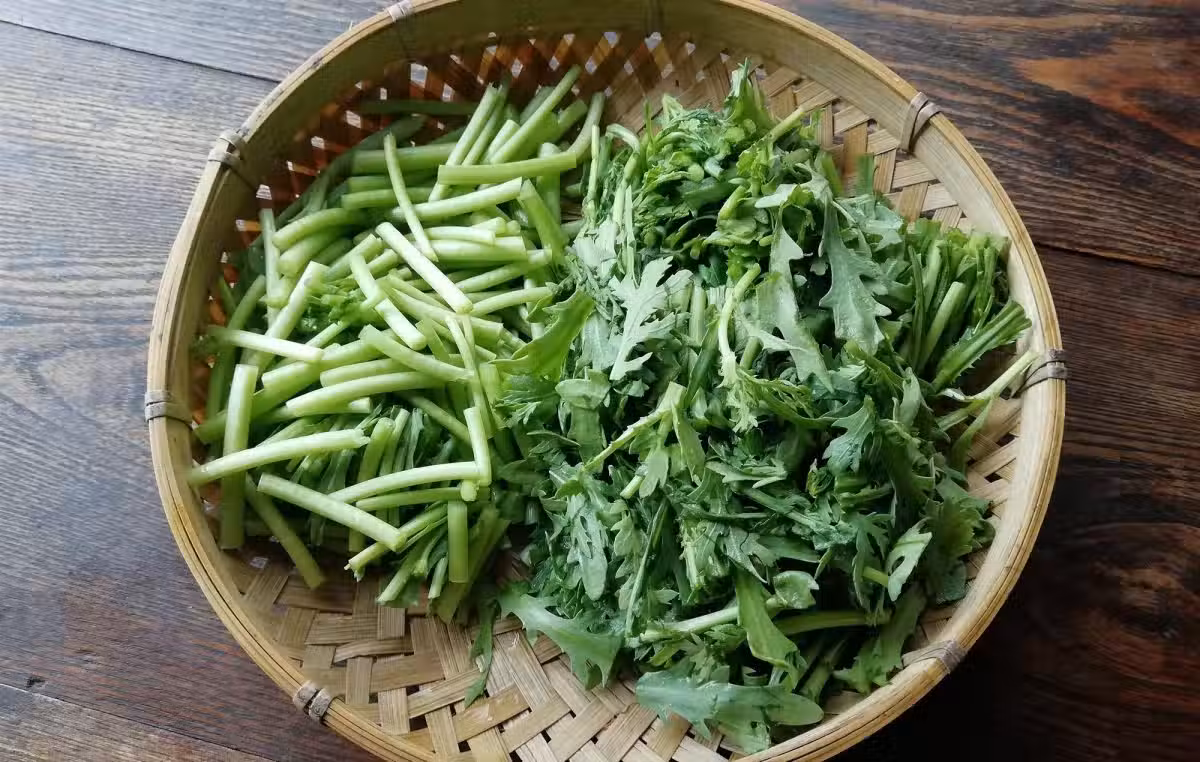 3.茼蒿切成寸段,茼蒿的梗部和葉部分開放,煮湯時,先下入茼蒿梗煮,再下入茼蒿葉煮,這樣茼蒿葉不會煮過火,梗和葉熟制時間一致