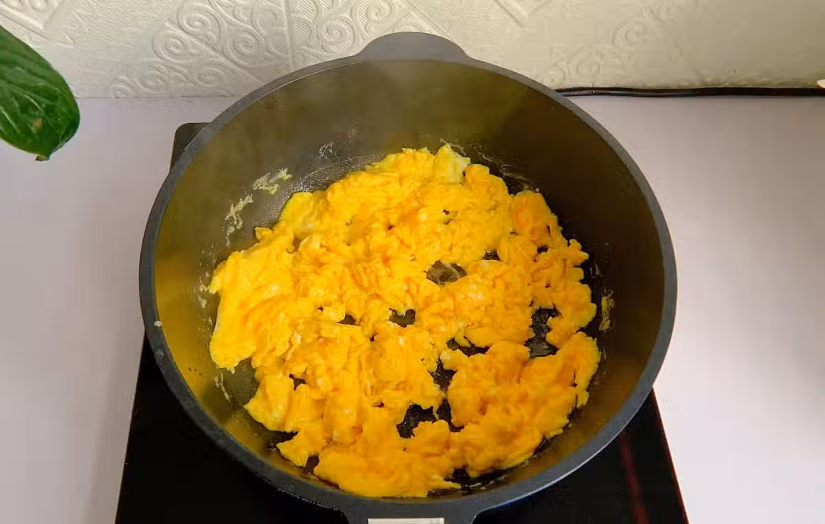 4.鍋中放油,倒入蛋液,將雞蛋炒散盛出。