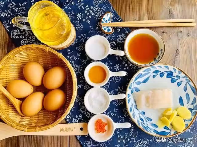 材料有,雞蛋,鹽,糖,料酒,米醋,魚子醬,薑片,龍利魚柳,白鬍椒粉