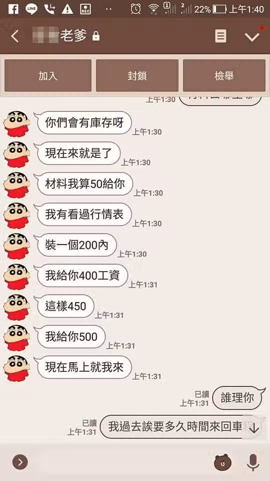 不過老闆卻表示,來回車程跟備料時間都不止這些,且深夜維修不降價,先給訂金才會出門,結果父親看了超不爽,表示一定要爆料,而且孩子生病就要告對方,痛批:「我會告你的,三思自重,勿自毀前程!」
