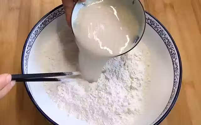 第二步:小碗里準備一勺麵粉,用剛燒熱的油拌勻,再加入適量鹽、五香粉調味,拌勻後得到一個稍微有點濃稠的油酥。