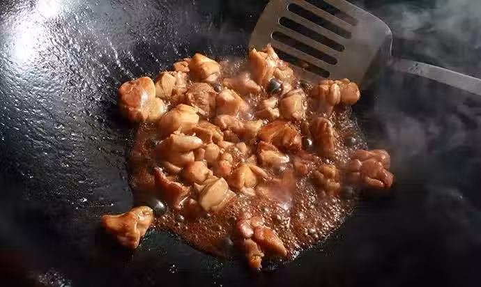 然後放入生抽,黃酒,葡萄酒,蚝油大火燒開,關中小火,點少許老抽上色,放鹽,糖和胡椒粉後燒五分鐘左右。