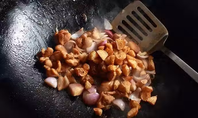 然後放洋蔥再燒三分鐘,最後把蒜仔放下去燒兩分鐘左右,這時候湯汁也快沒了,勾一點小芡就可以出鍋了
