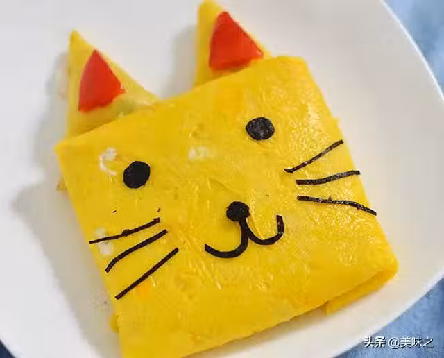 5、再煎一塊蛋皮,切成兩半,做貓的耳朵。