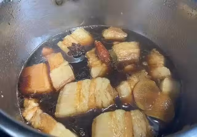 五花肉放高壓鍋,加半碗醬油、半碗料酒、適量老抽、5顆冰糖、適量姜、桂皮、香葉和八角,再加一大碗清水,高壓鍋上汽後,燉10分鐘就可以關火了。