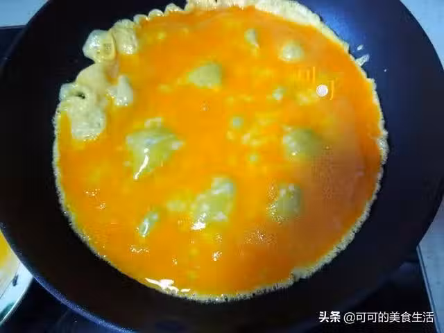 倒入雞蛋液,把鍋轉一圈,讓蛋液平均鋪滿鍋底,不用翻炒,因為有一定的溫度,下面的蛋液會迅速凝固。