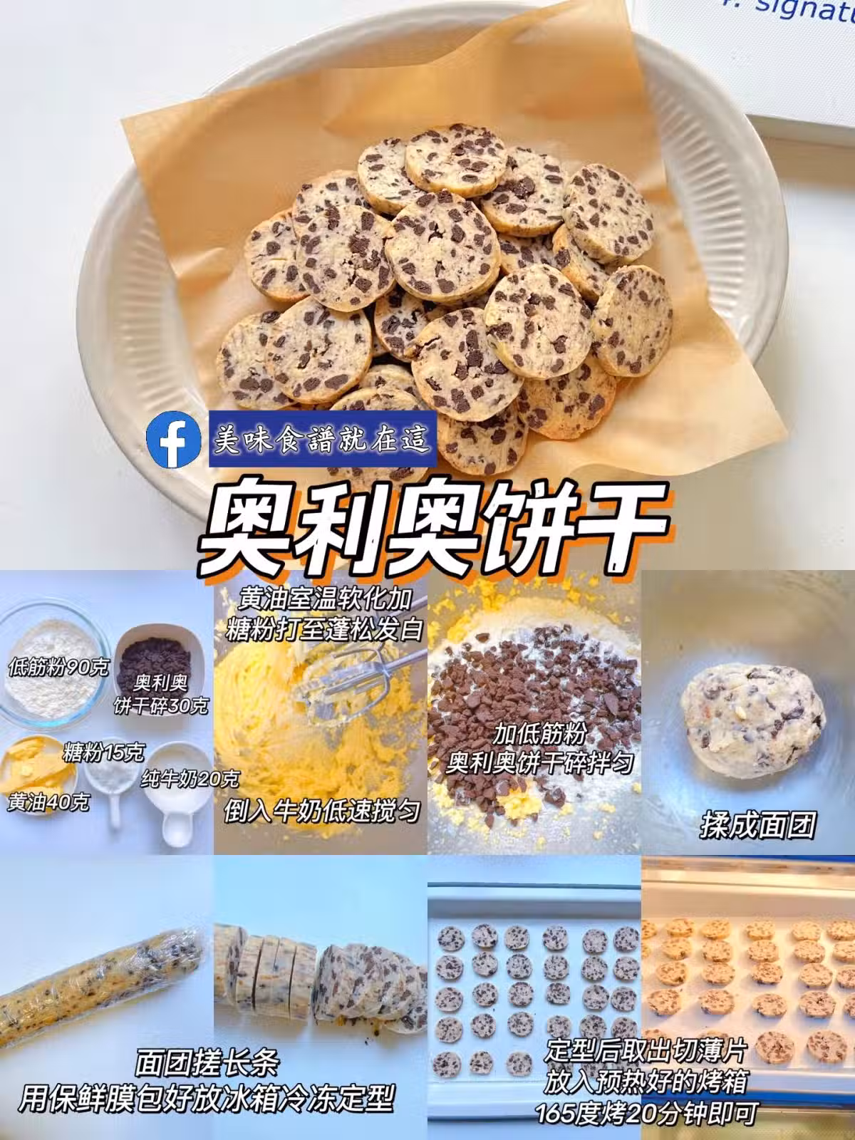 食材:黃油40克、純牛奶20克、糖粉15克、低筋粉90克、奧利奧餅乾碎30克