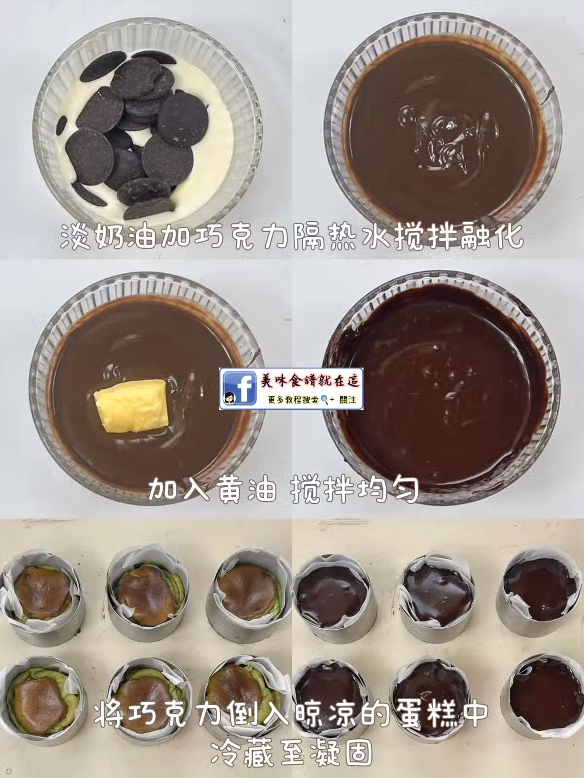 3️⃣淡奶油加巧克力隔熱水融化,加入黃油攪拌均勻,倒入晾涼的蛋糕中,冷藏至凝固