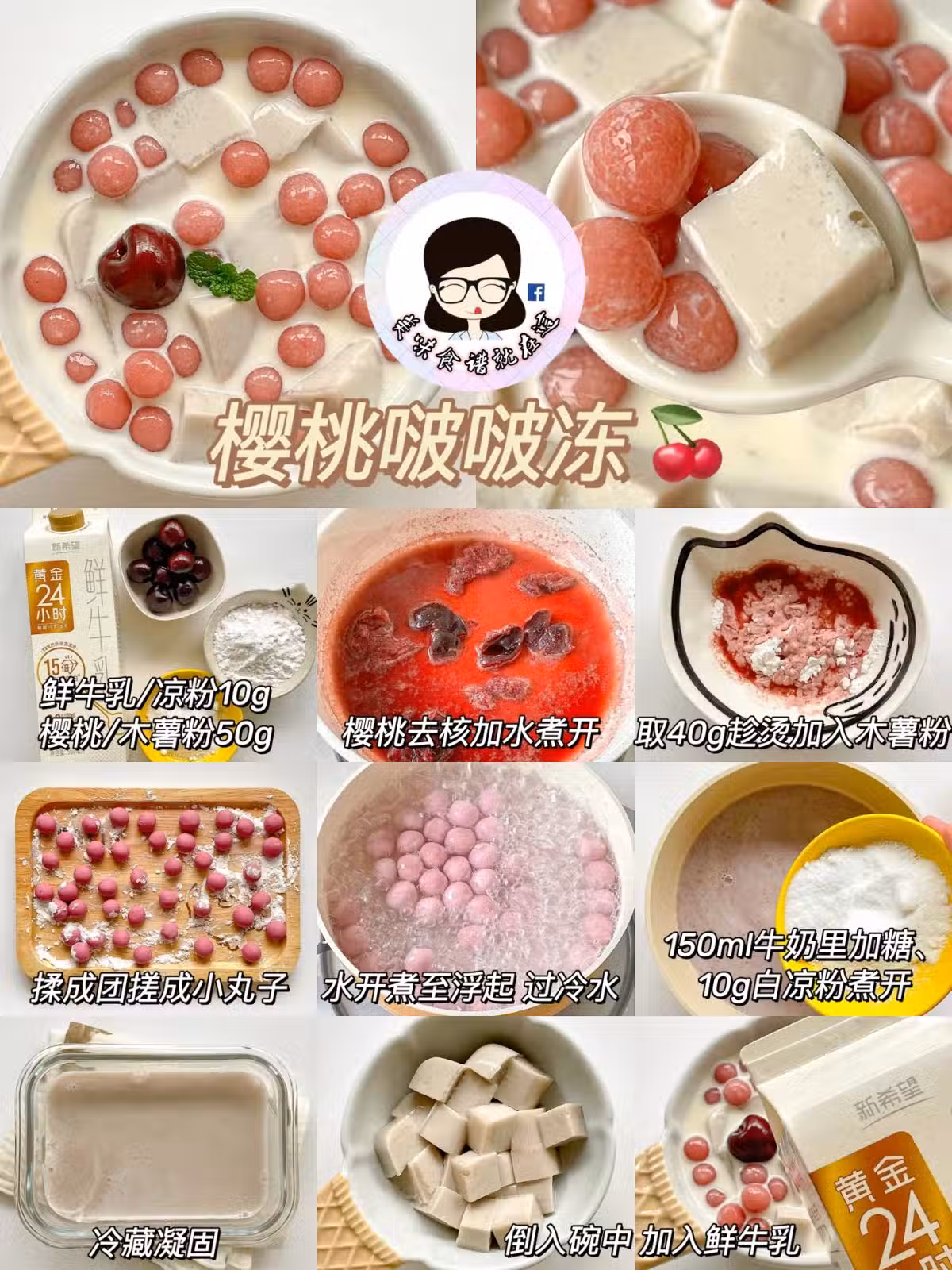 鮮牛乳、櫻桃、白涼粉10g、木薯粉50g