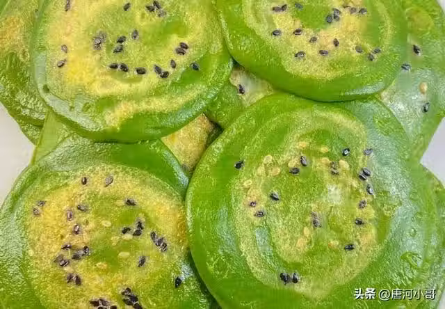 3.平底不粘鍋刷油,用湯勺舀一勺滴在鍋中做圓形狀煎,小火慢煎至凝固撒上芝麻,抹點攪拌好的雞蛋液(喜歡的可以多抹點),再翻面煎至凝固一小會兒即可開吃了。